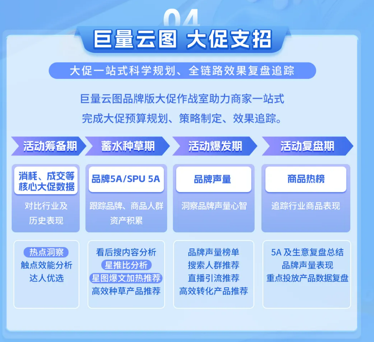 巨量云图品牌版大促作战室针对活动筹备期、蓄水种草期、活动爆发期、活动复盘期四个阶段推出不同应对策略和产品,助力商家一站式完成大促预算规划、策略制定、效果追踪。