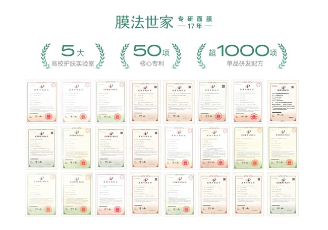 截至目前,膜法世家拥有50项专利、16项美白特证,自主研发单品配方超过1000项,不断夯实专业护肤的品牌形象。在多个爆品取得亮眼成绩的同时,膜法世家还获得了164项行业奖项。可以说,膜法世家以过硬的产品力获得了市场和行业的双重认可,实现口碑与销量的双重爆发。