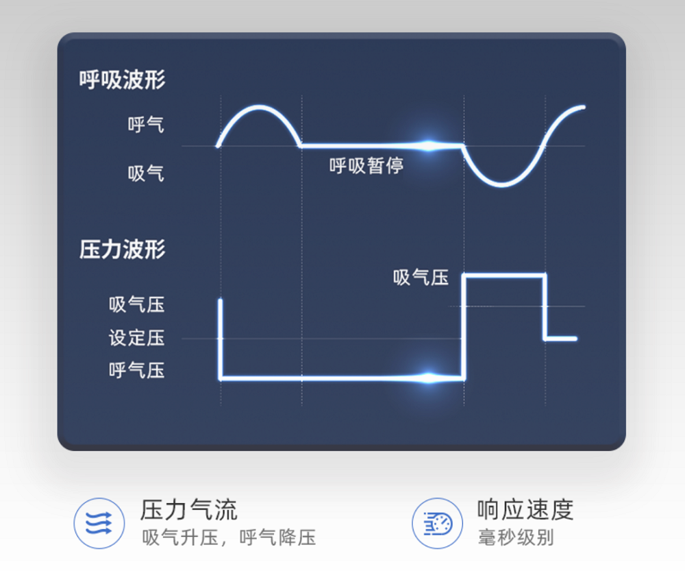 配备智能算法,可持续实时追踪用户的呼吸状态,根据用户呼吸模式的变化,自动科学调整压力参数,以提供最舒适、最有效的治疗。在此基础上,先进的传感器监测管路中的气流,以毫秒级别的速度进行响应,在发生打鼾、呼吸暂停等情况时,能快速感应判断吸气时,自动升压;呼气时,自动释放压力气流,让用户保持舒畅呼吸,实现人机同步。立即提高用户体内血氧量,改善睡眠质量。