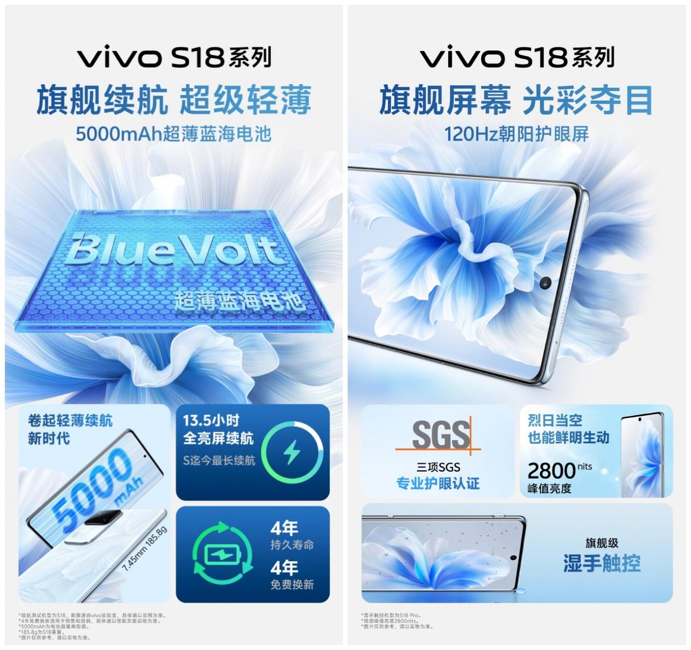 另外,vivo s18系列续航上有5000mah超薄蓝海电池,全亮屏续航能达到13.5小时,成为s系列迄今最长续航;屏幕上有120hz朝阳护眼屏,拿下三项sgs专业护眼认证,兼顾显示和护眼效果。